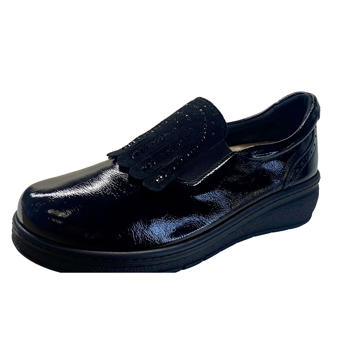 Offrez à vos pieds l’élégance sans renoncer au bien-être. Ce mocassin orthopédique pour femme Girly Noir combine un cuir verni élégant et des panneaux élastiques discrets pour un chaussage ultra-simple. Avec sa languette à franges décorée de strass, cette chaussure démontre que soutien thérapeutique et féminité s’accordent parfaitement.